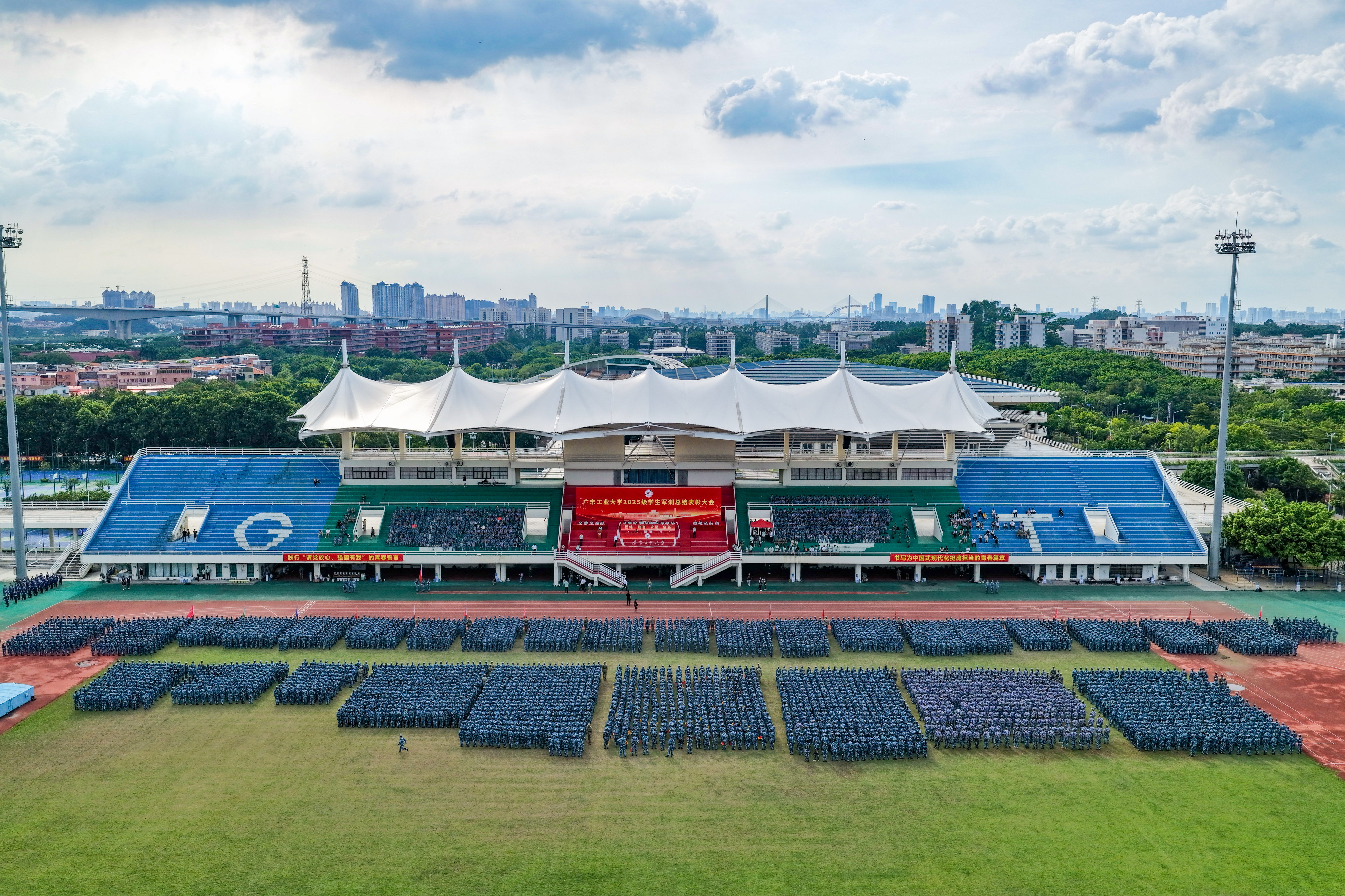 杜承铭、王振友分别在龙洞校区、揭阳校区讲话。陈卓武、余林、揭阳校区负责人分别宣读《关于表彰2025级学生军训先进集体和先进个人的决定》,校领导和承训单位领导为获奖集体和个人代表颁奖。白建刚、杜承铭、王振友、余林向承担本次军训任务的陆军特种作战学院、中国人民解放军91676部队、中国人民解放军92822部队、广州市越秀区人民武装部赠送锦旗。
