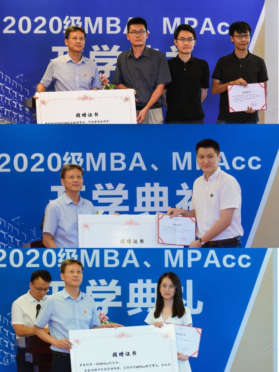 捐赠仪式上,管理学院党委书记陈楚泉为校友颁发捐赠证书并合影,感谢2017级MBA、2018级MBA以及第一届MPAcc的优秀校友对管理学院环境景观建设做出的贡献。优秀校友代表、管理学院2017级MBA李达理在开学典礼上分享了自己的求学感受,对管理学院各位老师的三年栽培表示感谢,并向2020级新生提出了倡议,希望新生珍惜在校时光,与同学多交流,与导师常沟通,奋发图强,感恩母校!