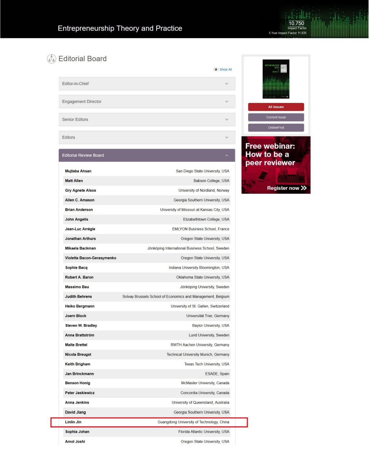 本网讯 我校管理学院晋琳琳教授受邀担任FT50期刊Entrepreneurship Theory and Practice(ETP)编委(Editorial Review Board member)。