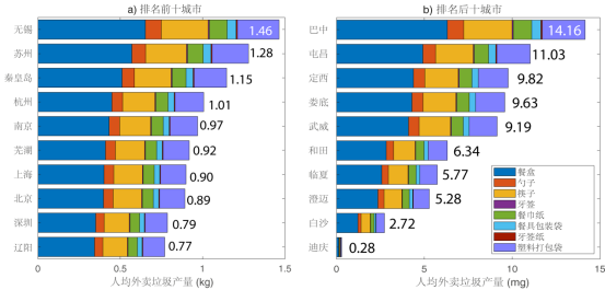 研究将主流在线外卖平台城市级大数据作为输入,采用自上而下方法核算中国外卖行业包装垃圾及生命周期环境影响。结果表明,2018年,4亿在线外卖用户共消费100亿份外卖,产生323 千吨一次性餐具和包装垃圾,排放709千吨二氧化碳,2千吨二氧化硫、2.6千吨氮氧化物、485吨细颗粒物、436毫克二恶英、2.8千吨化学需氧量,消耗246万立方米水资源。无锡等十个城市占全国7%人口,产生了全国30%外卖垃圾,贡献全国外卖包装27-32%环境排放和 30%水资源消耗。