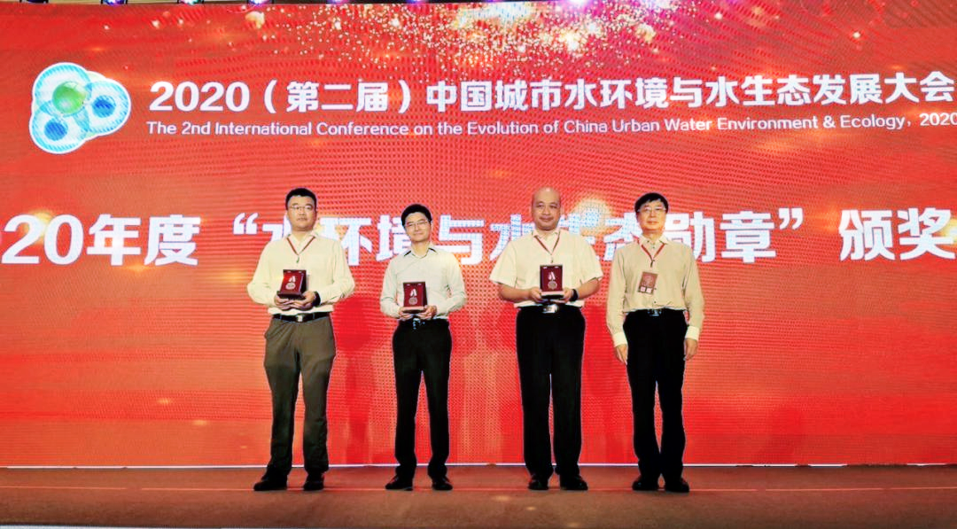 中国工程院院士曲久辉为“水环境与水生态青年创新勋章”获得者颁奖(左一为蔡宴朋教授)
