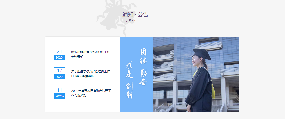 一般通知公告和简报都是纯文字的陈列模式,此次国资办首次采用图片加文字的方式展示通知公告和国资简报版块,且将“团结、勤奋、求真、创新”用动画的方式逐一显示,既增加了趣味性,又展示了学校的校园文化。