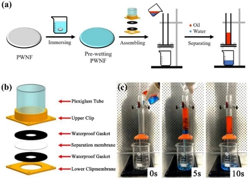 预润湿方法构建微通道油水分离界面,实现油水混合物的绿色、高效分离研究,提出基于Young–Laplace方程的预润湿方法,构建微通道油水分离界面机理,建立基于上述机理的聚丙烯-木浆纤维复合分离膜微通道表面油水分离模型与方法,证实了基于预润湿方法构建微通道油水分离界面,在不同海水环境、极端酸碱环境和不同温度下仍可实现高效油水分离。成功实现了煤油,石蜡油,硅油,花生油等油水混合物的高效分离(最高分离速度达到35 mm/s),可实现循环使用次数达40次以上。高效油水分离方法,该方法为清洁切削及切削液处理、水面油污处理等研究提供一种新方法。研究工作得到国家重点研发计划项目(NO. 2019YFB2005400)支持。