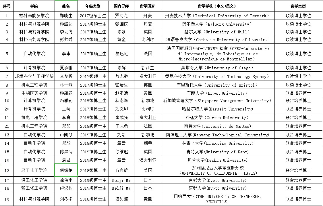 本网讯 近日,国家留学基金管理委员会公布了“2020年国家建设高水平大学公派研究生留学项目”录取人员名单,我校共有21名研究生榜上有名(5名研究生为我校“研究生拔尖创新人才培育计划”培育对象 ),其中8名同学被录取为攻读博士学位研究生,13名同学被录取为联合培养博士研究生(录取人员名单附后)。我校今年获得留学基金委资助人数较2019年增加2人,再次实现了新的突破。