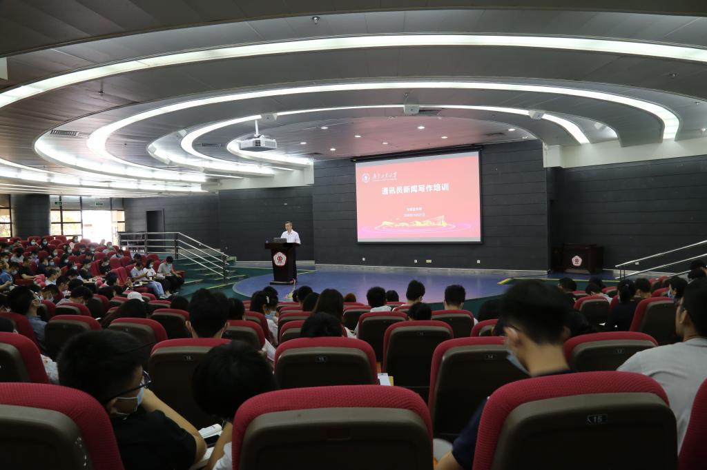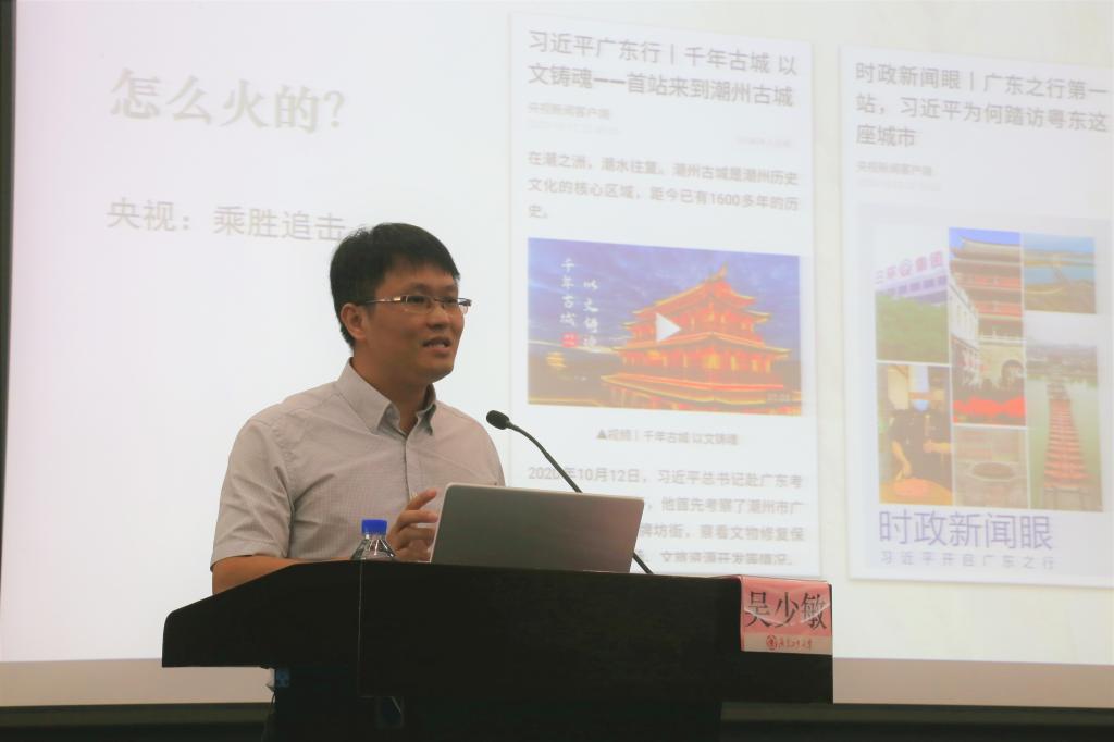 “最近有一条街火了,大家知道是哪一条吗?”“我们有个不成文的目标,那就是抢占朋友圈。”吴少敏以《新闻策划与新闻报道》为主题,从做好新闻要有高度、要有广度、要有速度、要有温度、要有知名度、要有角度、要有量度等方面,结合自己多年的新闻采写和报道经历,运用大量丰富又接地气的案例,深入浅出地讲授了如何紧跟国家“大气候”、如何开展新闻策划、如何让新闻报道更有传播力影响力等,并分享了自己在新闻宣传工作中的心得体会,为通讯员今后如何在校园内寻找亮点新闻线索,如何挖掘身边人身边事、新动态新成效等作了富有针对性的讲授。他说,新闻宣传工作者要成为媒体的朋友、要培养新闻敏感度、要发现学校闪光点、要做强自主新平台。