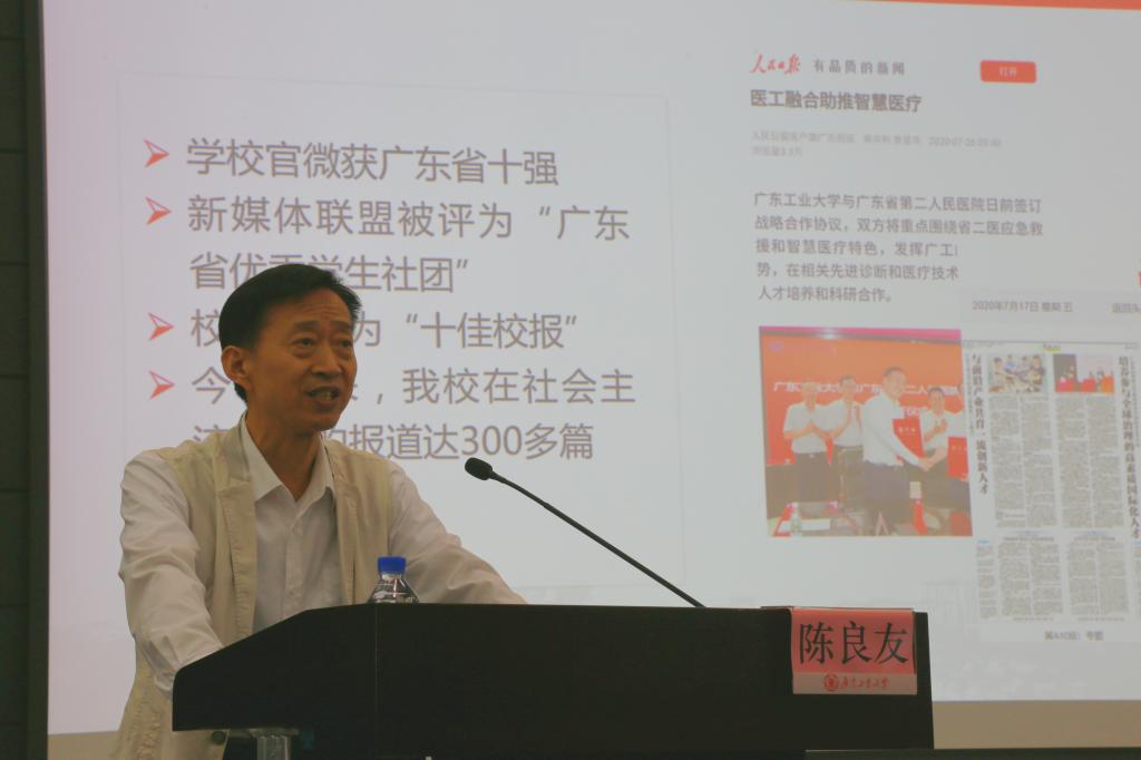 “只要勤学苦练,日积月累,不断增强‘脚力、眼力、脑力、笔力’,以‘高楼望尽天涯路’的视野、‘衣带渐宽终不悔’的执着、‘语不惊人死不休’的追求,就会走近‘笔落惊风雨,诗成泣鬼神’的境界。”陈良友以《深入学习贯彻习近平新闻舆论重要论述 不断提高新时代学校新闻舆论工作水平》为题作了培训动员讲话,他通过列举生动的事例,引用精辟的伟人语录,生动地阐述了要加强对习近平总书记关于新闻舆论工作重要论述的学习深化,切实提高对新闻舆论工作极端重要性的认识;要充分认识新闻舆论工作是党的优良传统,是各项事业不断取得胜利的重要法宝。他循循善诱、谆谆指导通讯员如何以创新精神提高学校新闻舆论工作的传播力、引导力、影响力和公信力,并分享了写作方面的体会和感受。他强调,要坚持党管宣传,学校各级党组织、党的工作部门及领导干部应承担起新闻信息发布、定调、把关的角色;要管好用好互联网;要打造协同共赢的媒体矩阵;要建设一支政治坚定、业务精湛、作风优良、党和人民放心的新闻舆论工作队伍。
