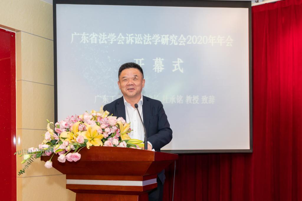 副校长杜承铭出席了年会开幕式并致辞,他代表学校对年会的顺利召开表示祝贺,向出席年会的各位领导、各位专家学者表示感谢。杜承铭介绍了我校法学学科的办学历程和发展愿景,他强调深化与政法机关、行业企业和实务机构的交流合作是法学学科发展提质增效的必由之路,他希望学术界和实务界的专家学者继续关心支持我校法学学科的发展,为我校法学教育工作献计出力。随后,广东省法学会专职副会长兼秘书长姜滨、广东省法学会诉讼法学研究会会长杨建广也分别致辞。开幕式上还确定了第五届理事会理事增退名单,宣读了获奖论文名单并进行颁奖。广东省法学会诉讼法学研究会副会长、我校政法学院院长邵俊武主持了开幕式。
