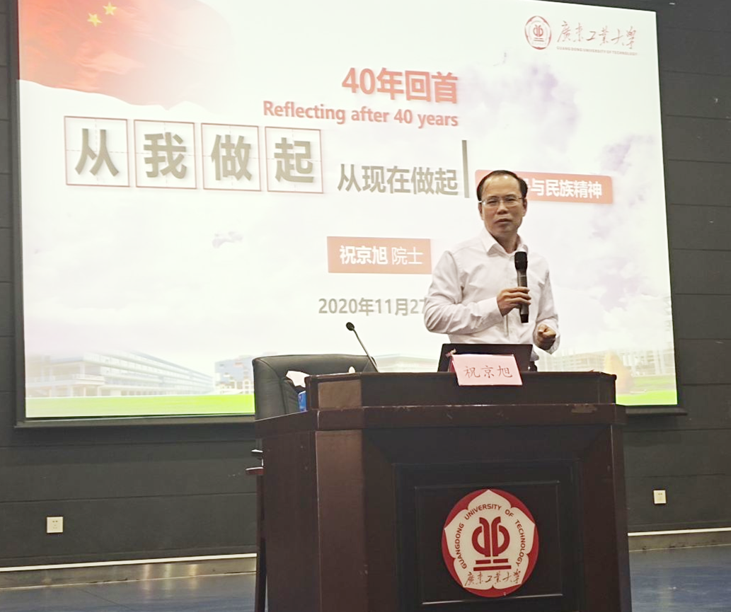 本网讯 11月27日,加拿大皇家学会院士、加拿大工程院院士祝京旭院士应邀到我校,在大学城校区圆弧报告厅为我校师生做题为《40年回首,“从我做起、从现在做起”的口号与民族精神》的讲座。邱学青校长主持讲座并介绍主讲嘉宾,来自轻工化工学院等近300名师生到场聆听讲座。