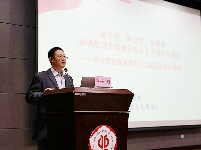 揭晓以《新阶段、新征程、新使命——协调推进全面建设社会主义现代化国家》为题作宣讲报告。他介绍了十九届五中全会召开的背景,指出这是我国处于“百年未有之大变局”和中华民族伟大复兴战略全局历史时期下召开的一次具有全局性、历史性意义的重要会议;引用详实的数据回顾决胜全面建成小康社会取得的决定性成就,分析“十四五”时期面临的形势;用“一个主题、二件大事、三个‘新’、‘四个全面’、五大理念、六个目标”阐述实现现代化的目标任务,即围绕建成社会主义现代化国家主题,统筹好发展和安全两件大事,立足新发展阶段、新发展理念、新发展格局,坚持“四个全面”、五大发展理念,实现“十四五”时期经济社会发展六大目标;解读了“十四五”时期的工作重点,强调创新在我国现代化建设全局中的核心地位,实现“十四五”目标必须坚持科技自立自强。最后,揭晓院长结合贯彻十九届五中全会精神,对学校第五次党代会精神进行宣讲,解读了学校“三步走”发展战略及未来五年工作重点,要学习贯彻好学校第五次党代会精神,为全面完成学校党代会提出的各项任务而努力奋斗。
