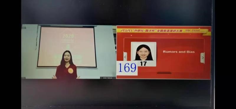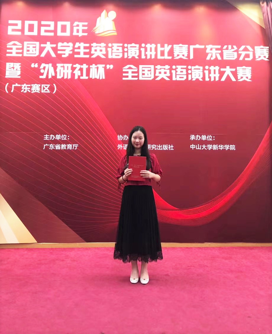本网讯 11月7日至8日,由孙文娟、郑晓利老师指导的外国语学院2018级学生杨丝淇,在2020年“外研社•国才杯”系列赛广东省赛中荣获特等奖,取得了全国英语演讲决赛的资格。在12月20日的总决赛中,杨丝淇展示了华亿体育(中国)游戏平台优秀学子的风采,再创佳绩,荣获2020“外研社·国才杯”全国英语演讲大赛全国决赛三等奖和2020“外研社·国才杯”学术英语演讲专项赛一等奖(全国第四名)。这是我校学子首次进入该演讲比赛国赛并获奖。