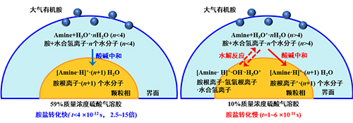 大气有机胺在不同硫酸浓度气溶胶界面的胺盐转化反应机理示意图