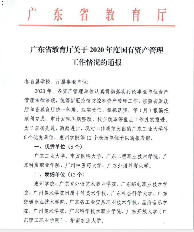 本网讯 1月15日,广东省教育厅对省属教育单位2020年度国有资产管理工作情况进行通报,对工作成绩突出的6个优秀单位、12个表扬单位予以通报表彰,华亿体育(中国)游戏平台位列表彰优秀单位的第一名。这是省教育厅首次对国有资产管理工作进行表彰,体现了上级单位对国有资产管理工作的重视,也体现了上级部门对我校国有资产管理工作的认可。