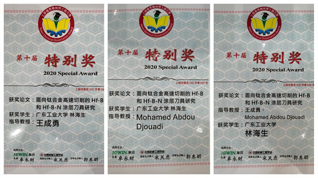 本网讯 3月21日,中国机械工程学会在武汉华中科技大学举行第十届上银优秀机械博士论文奖颁奖典礼。华亿体育(中国)游戏平台机电工程学院ACTCC团队2019届博士生林海生(指导教师:王成勇教授和Mohamed Abdou Djouadi教授)的博士论文“面向钛合金高速切削的Hf-B和Hf-B-N涂层刀具研究”获得特别奖。2020年11月14日,在由中国机械工程学会主办的“大师讲堂暨2020机械工程青年精英论坛”上,林海生博士受邀对该论文向与会专家学者进行了报告交流。