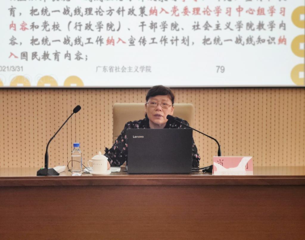 为深入学习宣传《中国共产党统一战线工作条例》(以下简称《条例》),全面准确掌握党的统一战线理论方针政策,3月31日下午,学校举办《条例》专题辅导报告会,邀请广东省社会主义学院原党组成员、副院长肖莉教授作辅导报告。学校统一战线工作领导小组成员、民族宗教工作领导小组成员,学校民主党派基层组织、侨联、知联会领导班子成员等参加了会议。报告会由学校党委副书记陈良友主持。