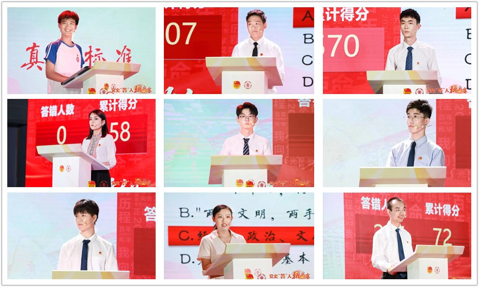 党史“答”人挑战赛总决赛分为“以一敌百”“抢占先机”“巅峰对决”三个环节,题目内容涵盖新民主主义革命时期、社会主义革命和建设时期、改革开放和社会主义现代化建设新时期和中国特色社会主义新时代的中国共产党历史。竞赛过程设置了选手和500名观众答题PK,抢答赛,车轮战,马克思主义学院教师党史评述授课,反映爱国、奋斗、青春等主题的文艺表演等诸多环节,用青年学生便于参与、乐于参与的方式,引领青年学生学习党史、增强信念,从党的百年伟大奋斗历程中汲取继续前进的智慧和力量。经过激烈角逐,来自机电工程学院2017级机械电子工程专业机械电子工程创新班团支部的廖智燊获得冠军,来自土木与交通工程学院2018级工程管理2班团支部的杨超获得亚军,来自材料与能源学院2019级材料工程研究生团支部的吴畏获得季军;娜孜拉·木塔里甫、陈丹妮、蔡钊、何纯颍、王缘、李天恩6名同学获得优胜奖。