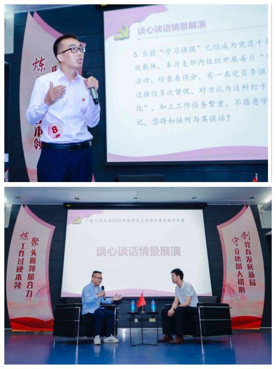 谈心谈话制度是我们党的优良传统,也是党的组织生活重要形式。在谈心谈话情景展演中,选手针对选取题目,在分析问题本质、进行思路概述基础上,再与组织方安排的助演情景呈现谈心谈话过程。现场,12位支部书记循循善诱,情理交融,充分展示了教师党支部书记准确把握问题实质和解决问题的逻辑性、完整性,以及准确运用理论、政策和业务知识,掌握党员干部思想动态、深化交流沟通、做好思想政治工作的能力。