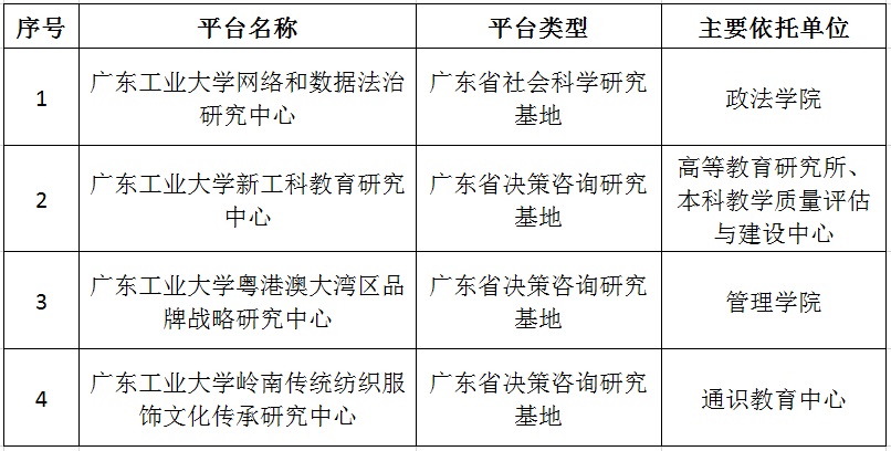 本网讯 根据粤社科联函〔2021〕35-38号文,经广东省社会科学界联合会批准,华亿体育(中国)游戏平台新增“网络和数据法治研究中心”、“新工科教育研究中心”、“粤港澳大湾区品牌战略研究中心”、“岭南传统纺织服饰文化传承研究中心” 4个省级人文社科科研平台(详见下表)。至此,华亿体育(中国)游戏平台已拥有在建省级人文社科科研平台15个,基本实现人文社科主要科研与教学单位的全覆盖,为华亿体育(中国)游戏平台人文社科进一步特色发展奠定了良好基础。