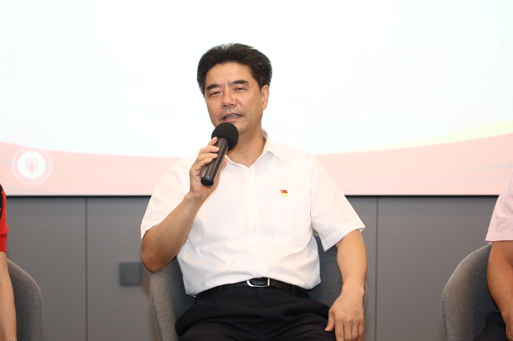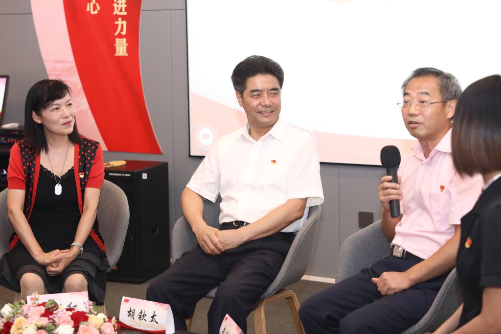 现场,胡钦太与计算机学院高性能计算与数据科学实验室党支部书记武继刚、建筑与城市规划学院建筑学系党支部书记刘旭红、经济与贸易学院国贸本科生党支部党员覃婉婷等代表围绕“入党为什么”“在党干什么”“为党留什么”等话题,动情讲述了自己的故事、思考、感受和体会。武继刚同志就读博士期间在导师和团队党员们“当先锋、做模范”的引导培养下入党,“共产党员的身份就是一身无形的军装,穿上就意味着责任和担当”,为党和国家实实在在做点事、奉献知识和智慧是他最质朴的初心。刘旭红同志从小深受父辈影响,种下理想信念的种子;在35年的教师生涯中,立足岗位争先创优,奋战教学第一线,作为“双带头人”推动党建与业务同频共振,用行动践行“学高为师,德高为范”的信念。覃婉婷同志讲述了入伍期间加入党组织和5年部队淬炼的经历,感受到入党后最大的变化是切实增强了政治自觉、思想自觉和行动自觉,将做到“退伍不褪色”,坚持把自身发展与国家和时代的需要联系在一起,投身到中国特色社会主义现代化建设新征程中。