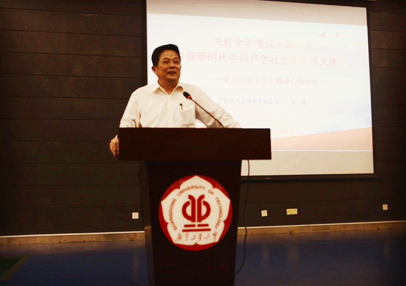 本网讯 11月14日下午,我校在大学城校园大讲堂圆弧报告厅召开党的十九大精神专题辅导报告。党的十九大精神广东宣讲团成员,广东省社会科学界联合会党组书记、主席王晓应邀作了题为“决胜全面建成小康社会,夺取新时代中国特色社会主义伟大胜利”的专题辅导报告。校党委书记、校长陈新主持报告会。
