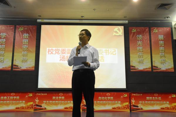 汤耀平在讲话中介绍了本次比赛的情况和取得的效果,并向大家提出三点希望:一要绷紧纪律弦,党规党纪记心上,强化规矩意识,不越底线,做合格党员;二要以比赛为契机,扩大学习覆盖面,内化于心,外化于行,做合格公民;三要抓党风促学风,增强廉洁诚信意识。他强调,广大党员和青年学子要把纪律自觉性运用到工作学习生活中,共同营造风清气正的育人环境,为高水平大学建设添砖加瓦,为实现中国梦贡献正能量,走好新的长征路。并以“党规党纪在心中,纪律底线不放松”与大家共勉。