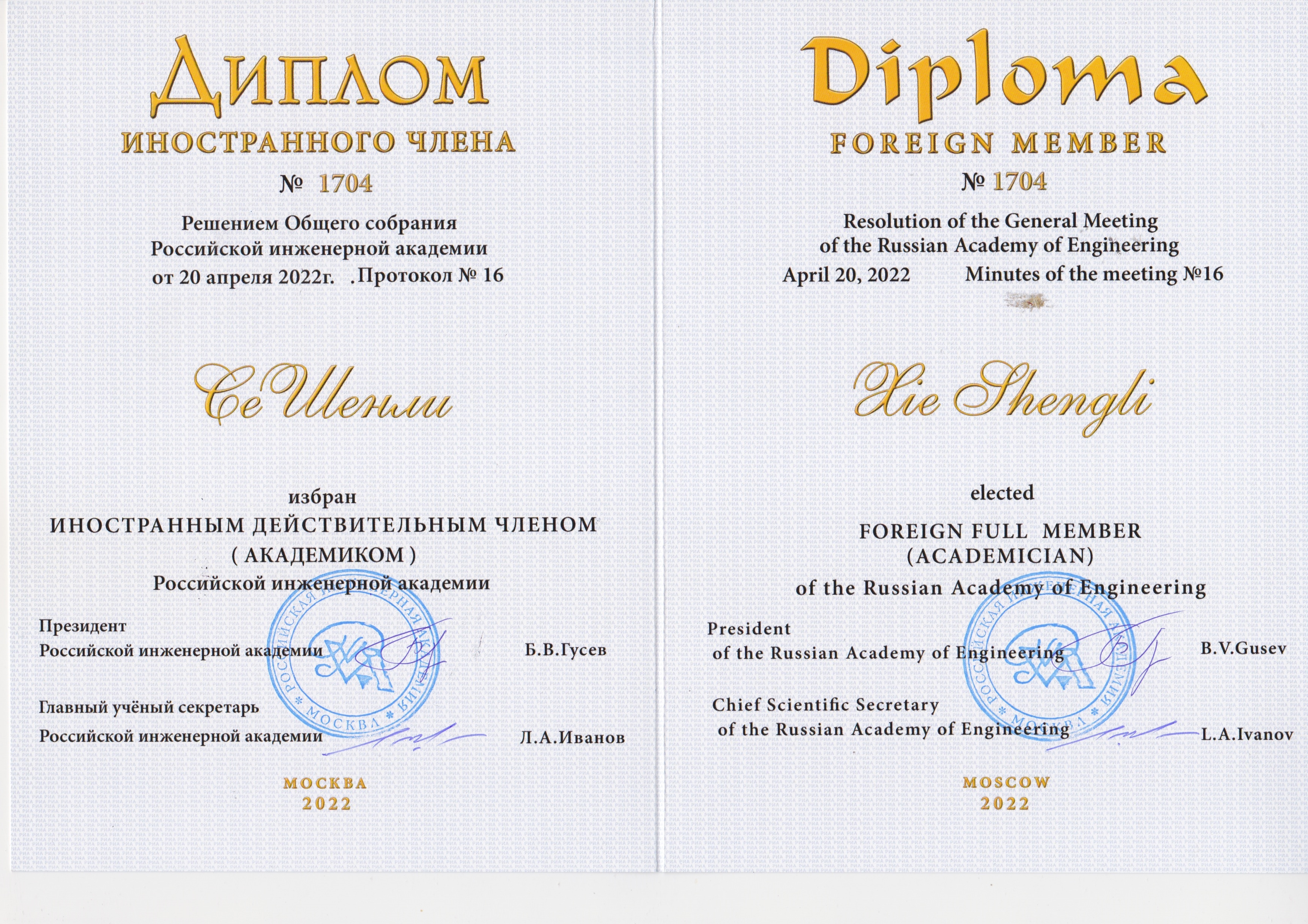 在为谢胜利教授颁发外籍院士证书的会上,俄罗斯工程院学部主任Kuzin院士祝贺他成功当选俄罗斯工程院外籍院士,并介绍道:谢胜利教授依托中国111学科创新引智基地,与俄罗斯工程院院士Kuzin教授和Gorbachev教授长期合作(联合申报中国科技部国际交流合作项目、合作出版专著、联署发表论文、共同申请国际专利等系列国际学术交流)。由于合作成效突出,经Kuzin院士和Gorbachev院士联名推荐,俄罗斯工程院所属学部审查和筛选以及俄罗斯工程院年度院士大会评选,表决通过谢胜利教授为俄罗斯工程院外籍院士。