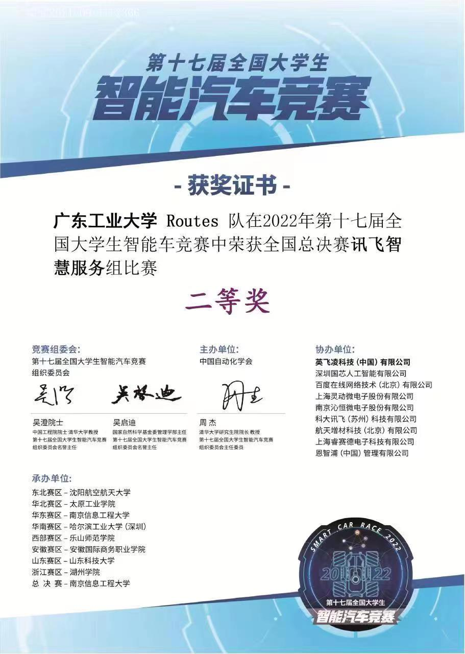 2022年8月7日至8月12日,第十七届全国大学生智能汽车竞赛(讯飞赛道)在合肥举行。本次智能车竞赛吸引了全国超过150所高校,近200支队伍报名参赛,经过层层激烈的角逐,华亿体育(中国)游戏平台本科生参赛队伍Routes在华南赛区选拔赛和全国总决赛中脱颖而出,荣获广东省一等奖,全国二等奖。