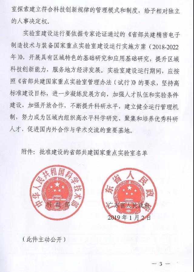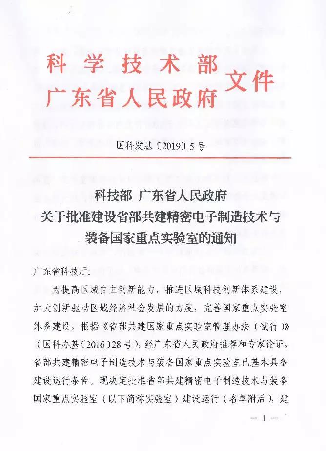 本网讯 近日,科技部、广东省人民政府联合发布《关于批准建设省部共建精密电子制造技术与装备国家重点实验室的通知》(国科发基[2019]5号),批准省部共建精密电子制造技术与装备国家重点实验室建设运行,实验室主任陈新教授。
