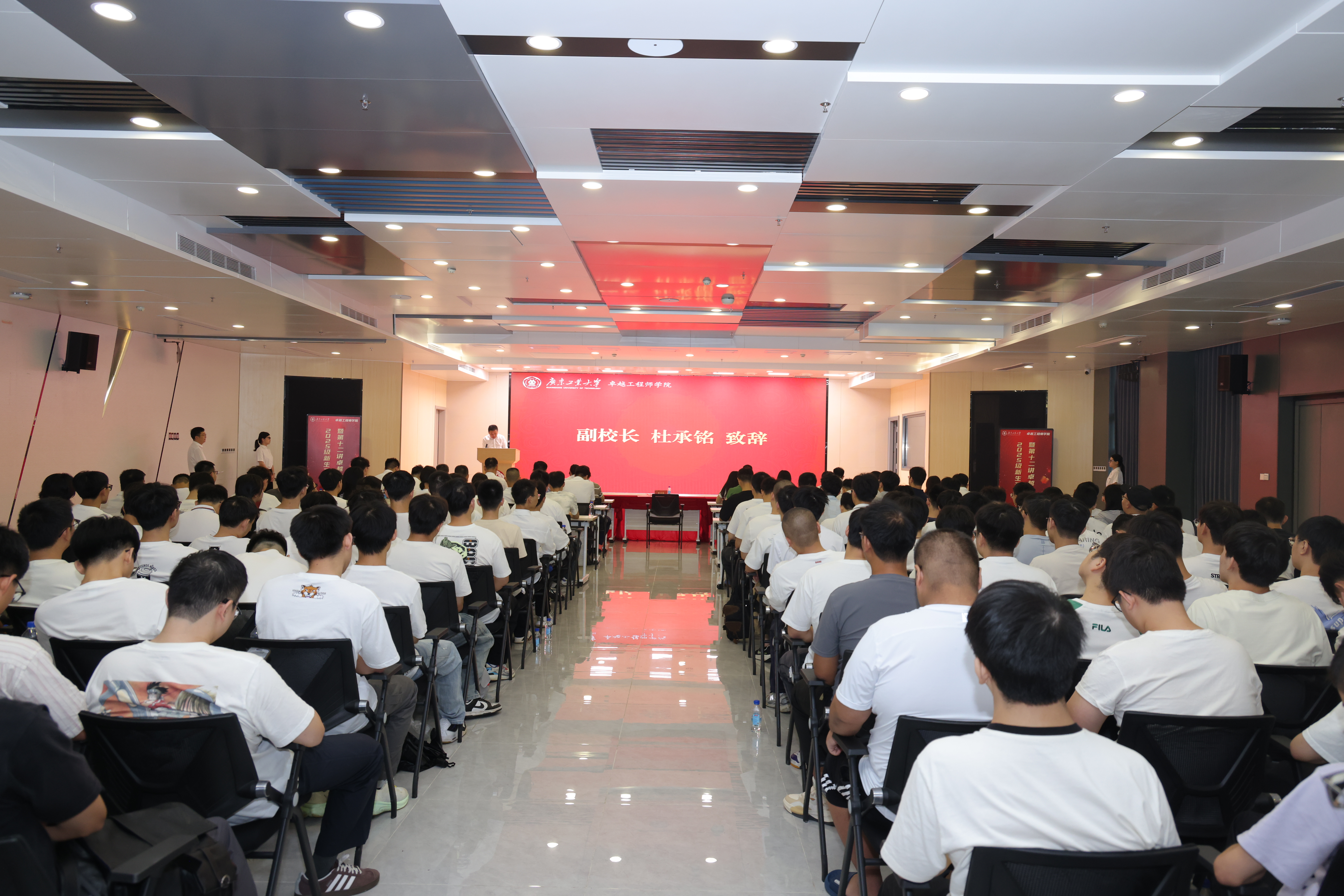 在致辞中,杜承铭对2025级新同学表示热烈欢迎,并详细介绍了学院办学目标和建设情况。他特别强调学校作为首批广东省工程硕博士培养改革专项试点高校,于2025年3月正式成立了卓越工程师学院。作为独立的二级人才培养机构,卓工学院将探索校企全程协同的卓越工程师培养模式。这是学校深化工程硕博士产教融合培养体系改革、加快培养卓越工程师的重要举措,也是学校办学事业发展的重要里程碑。杜承铭寄语新生要“心怀祖国”“厚基博通”“勇于创新”“敢于实践”,勉励他们要在这片创新的沃土上尽情汲取养分,茁壮成长,用奋斗书写无悔青春,用实干铸就卓越未来。