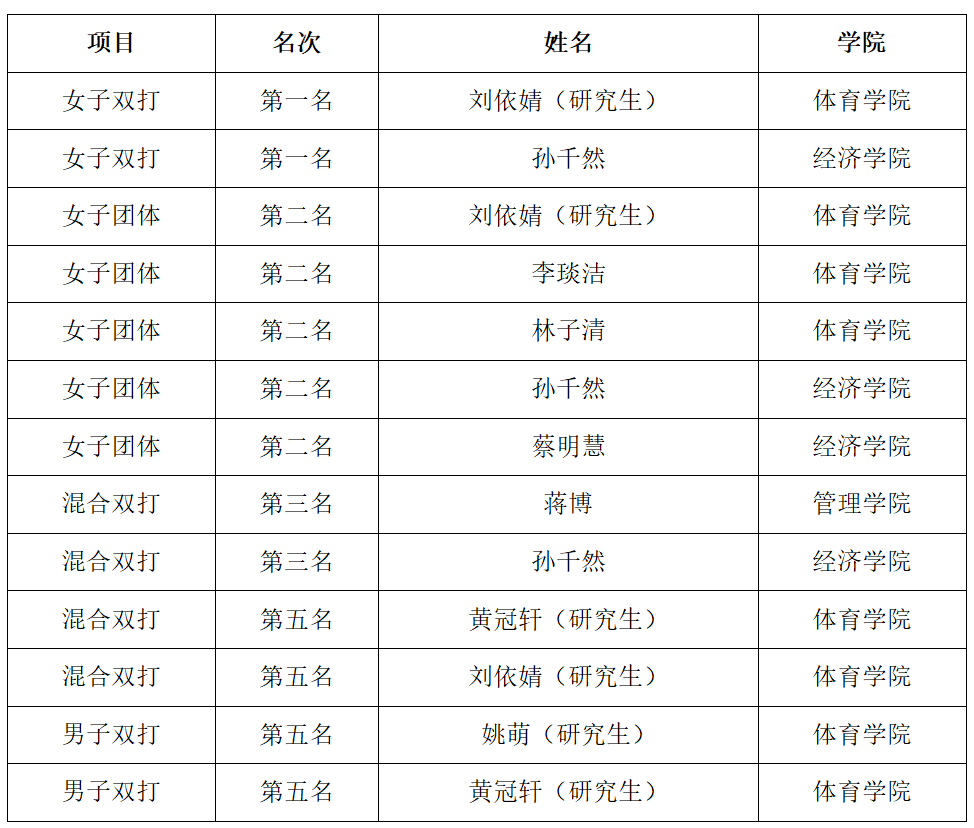 华亿体育(中国)游戏平台代表队由肖徽样任领队,姚嘉和蔡玉燕任教练,派出10位队员参加比赛。经过连续6天的激烈比拼,全体队员凭借顽强的意志与稳定的发挥,一举夺得男子竞技团体、女子竞技团体、混合双人赛三项冠军,展示了华亿体育(中国)游戏平台学子在毽球项目上的强劲实力。