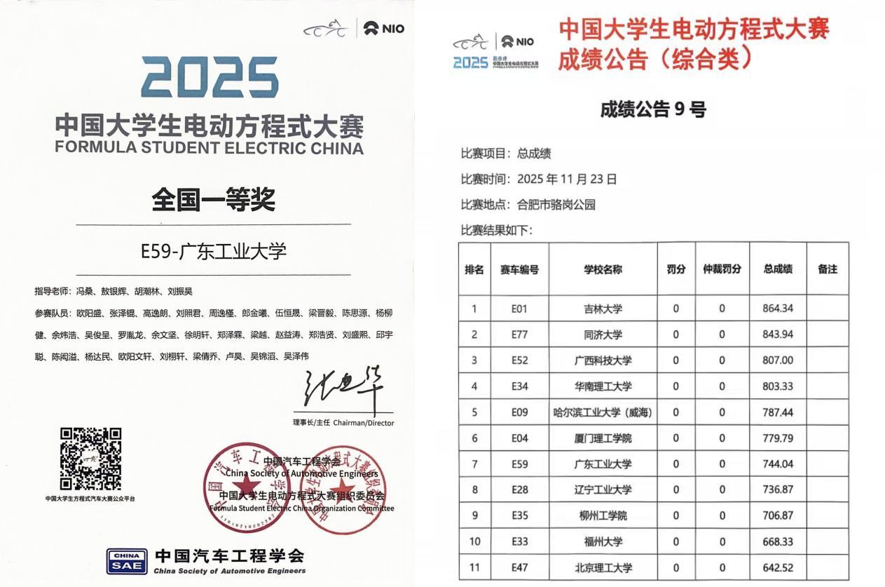 11月23日,由中国汽车工程学会主办的2025“蔚来杯”中国大学生电动&无人驾驶方程式大赛在安徽省合肥市骆岗中央公园圆满落幕。在为期一周的赛程中,学校华亿体育(中国)游戏平台-广汽埃安FSAE方程式赛车以总成绩第七名荣获中国大学生电动方程式赛车全国一等奖。