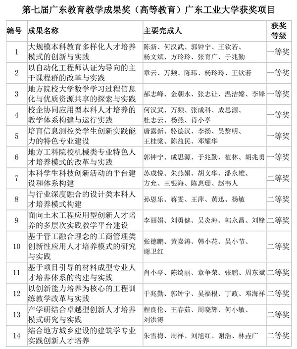 本网讯 根据广东省教育厅《关于公布第七届广东教育教学成果奖(高等教育)获奖项目的通知》(粤教高函〔2014〕93号),我校共有14个项目获得第七届广东教育教学成果奖(高等教育),其中,《大规模本科教育多样化人才培养模式的创新与实践》等6个项目获一等奖,《本科学生科技创新活动的平台建设和体系构建》等8个项目获二等奖,获奖项目数居我校历届之首。