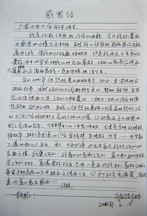 我是你校伍熙帆同学的母亲,今日我怀着无比感恩的心情写这封信,虽然我儿伍熙帆因病医治无效离开了我,使我的心很痛、很难过,但是我永远不会忘记贵校师生四年来对我儿的无私奉献,你们的高尚品质和大爱精神永远激励着我一定要坚强地活下去。