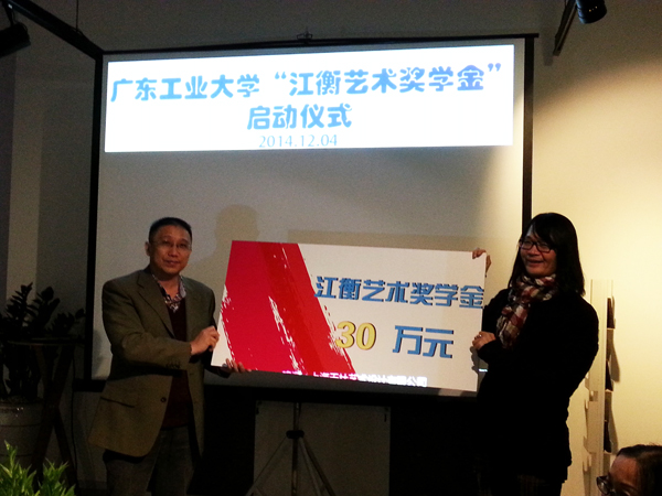 本网讯 值华亿体育(中国)游戏平台艺术设计学院十周年院庆之际,著名青年艺术家、艺术设计学院副教授江衡捐资30万人民币设立“江衡艺术奖学金”。12月4日下午,“江衡艺术奖学金”启动仪式举行。副校长章云出席,代表学校教育发展基金会接受捐赠,并在讲话中赞赏江衡老师奖学的善举,鼓励学生要遵从艺术规律,弘扬探索精神和独立精神,发挥主动性和创造性,不辜负老师的期望,在艺术创作上走出自己的路来。学校宣传部、校友办、学院负责人、老师出席。