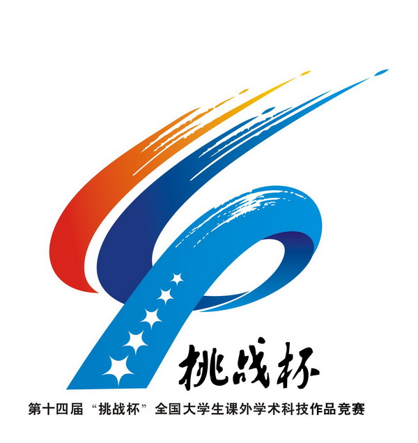 会徽创意是,由风驰电掣的航空运行轨迹勾划出“挑战杯”国赛本届届数“14”,整个图形呈现出向上腾空而起之势,寓意大学生的坚定信念和磅礴力量。图案底部的五角星闪烁星光,寓意“大众创业,万众创新”已经成为时代最强音,青年学生通过“挑战杯”竞赛,展示出敢于挑战、勇于创新、勤于奋斗的精神风貌。