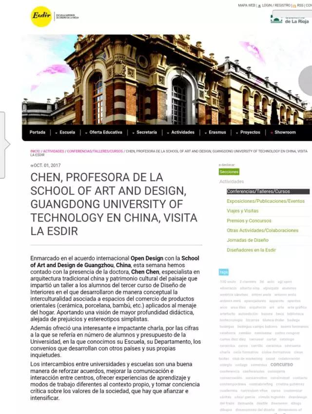 本网讯 9月下旬,我校艺术与设计学院教师陈晨,前往西班牙拉里奥哈设计学院(ESDIR)进行为期一周的教学与交流活动。期间开展了14学时的设计工作坊教学,作了题为《中国传统建筑室内装饰及当代发展》的讲座,并对该校学生进行了分组设计指导。西班牙拉里奥哈设计学院(ESDIR)院长及专业教师,对陈晨老师的教学给予高度肯定,并将教学过程发布在该院的官方网站上。这是一次成功的国际教学交流活动。