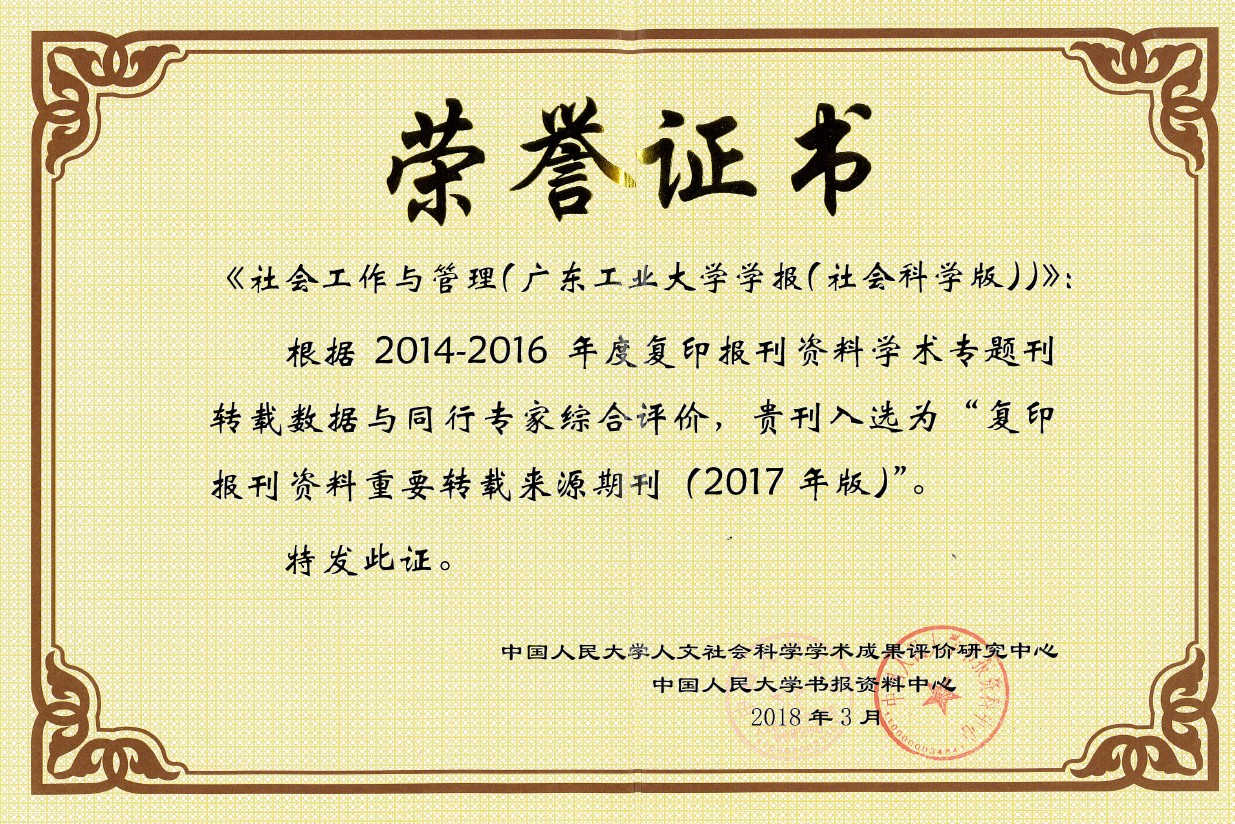 本网讯 近日,《社会工作与管理》(原《华亿体育(中国)游戏平台学报:社会科学版》)入选中国人民大学人文社会科学学术成果评价中心和中国人民大学书报资料中心联合研制的“复印报刊资料重要转载来源期刊(2017年版)”。该遴选每三年进行一次,是国内重要的学术期刊评价体系之一。在2017年度复印报刊资料转载指数排名中,《社会工作与管理》全文转载率达到9.52%,在全国195种社会学学科期刊中位列第11名,综合指数位列第14名,进入社会学期刊十五强。在全国1150种高校主办的学报中,《社会工作与管理》全文转载率位列第83名,综合指数位列第88名,跻身高校学报百强。