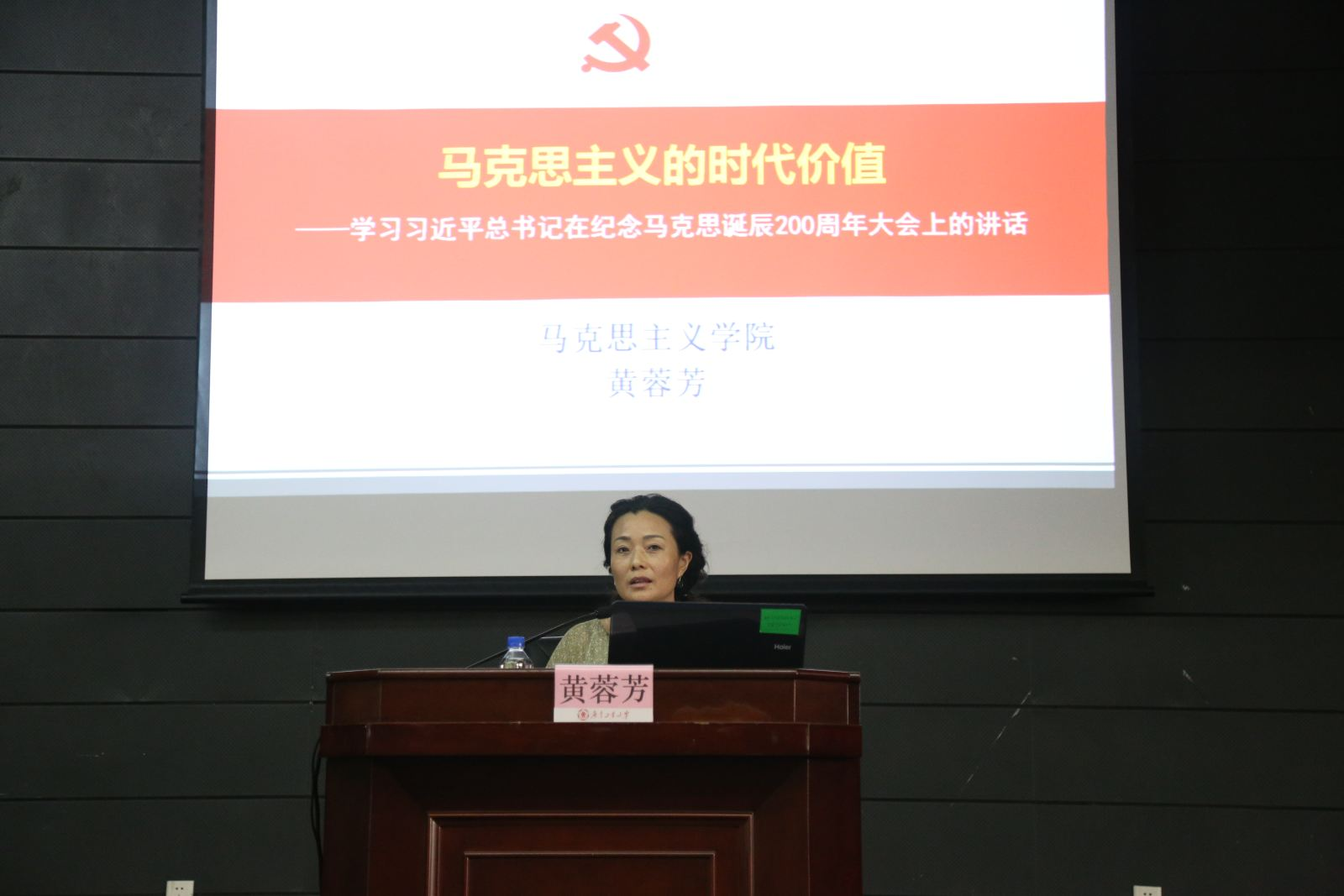 黄蓉芳教授以《马克思主义的时代价值——学习习近平总书记在纪念马克思诞辰200周年大会上的讲话》为题,结合历史和现实,从伟大的思想家与伟大的思想、马克思的精神品格、马克思主义的时代价值三个方面对习近平总书记在纪念马克思诞辰200周年大会上的讲话进行了深入分析和深刻阐释。