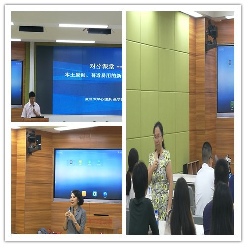 “对分课堂”是由复旦大学张学新教授结合讲授式课堂与讨论式课堂的优点而创立的新型教学模式,其核心理念是分配一半课堂时间给教师讲授,另一半给学生讨论,并把讲授和讨论时间错开,在讲授和讨论之间引入一个心理学的内化(Assimilation)环节,让学生对讲授内容进行个性化的吸收之后,再参与讨论。“对分课堂”重新定义了课堂和师生关系,是对传统课堂的新突破。通过学习张教授的精彩课程后,我校教师们对“对分课堂”教学模式的新理念和新方法有了深刻的认识和理解,在今后组织课堂教学、解决课堂问题、提升学生兴趣等方面,又增加了新的方法和理论指导。