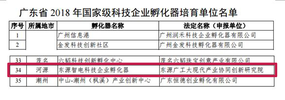 本网讯 近日,广东省科学技术厅公布了2018年国家级科技企业孵化器培育单位名单,东源华亿体育(中国)游戏平台大现代产业协同创新研究院申报的“东源智电科技企业孵化器”获得认定,是东源县首家国家级科技企业孵化器培育单位。