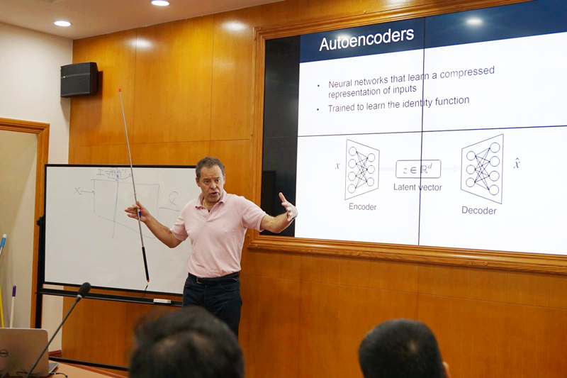11月2日上午,意大利米兰理工大学的Cesare Alippi教授应邀在我院开展主题为“Change detection in graph streams(图形流中的变化检测)”的专题课程。Cesare Alippi教授是国际知名人工智能领域的专家,他通过“神经自编码网络”引出课程主题,从“将图形转化成矩阵”、“应用多变量统计监测”、“实行图形的建模”三方面层层递进,展开对课程的核心内容——图形建模(CDT on graph)的描述。最后,介绍了对抗式自编码网络和CMM自编码网络预测。课程在同学们热烈的掌声中结束。