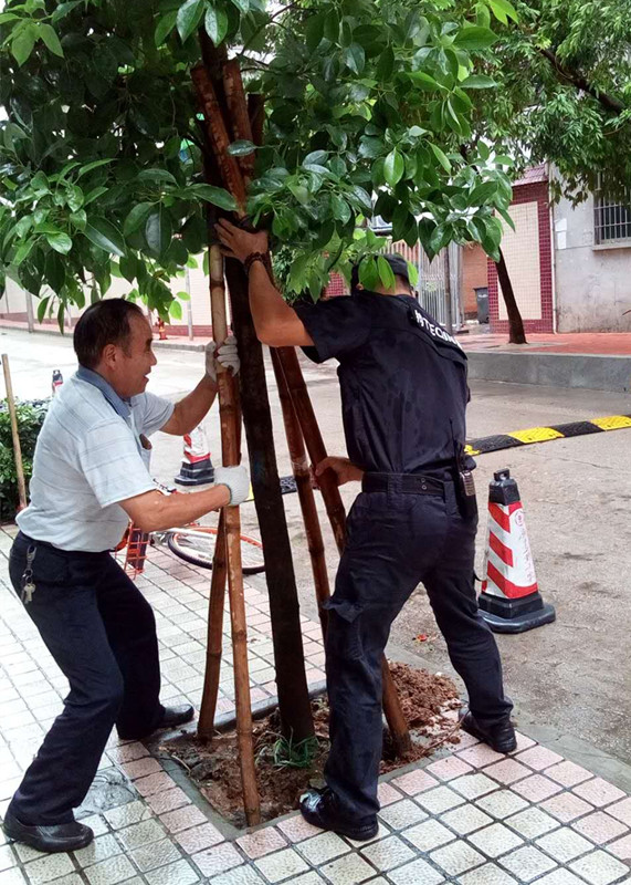 工作人员及时加固树木
