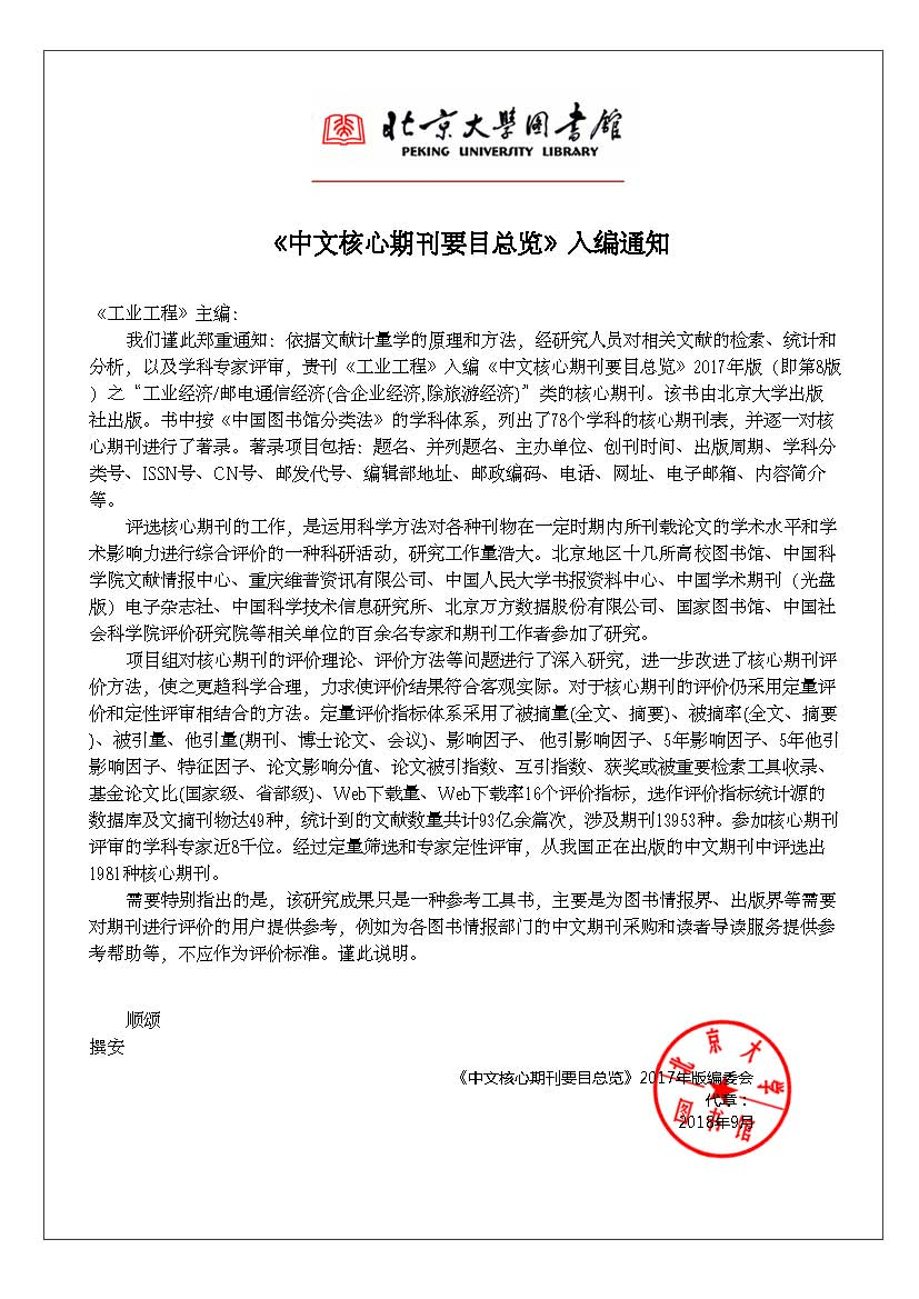 本网讯 近日获悉,《工业工程》入编《中文核心期刊要目总览》2017年版(即第8版)之“工业经济/邮电通信经济(含企业经济,除旅游经济)”类的核心期刊。此版《中文核心期刊要目总览》由北京大学图书馆联合北京地区十几所高校图书馆、中国科学院文献情报中心、重庆维普资讯有限公司、中国人民大学书报资料中心、中国学术期刊(光盘版)电子杂志社、中国科学技术信息研究所、北京万方数据股份有限公司、国家图书馆、中国社会科学院评价研究院等相关单位的百余名专家和期刊工作者参加研究。研究采用定量评价和定性评审想结合的方法。定量评价指标体系采用了16个评价指标,选作评价指标统计源的数据库及文摘刊物达49种,统计文献数量约93亿余篇次,涉及期刊13953种。参加评审的学科专家近8千位。经定量筛选和专家定性评审,从我国正在出版的中文期刊中评选出1981种核心期刊。
