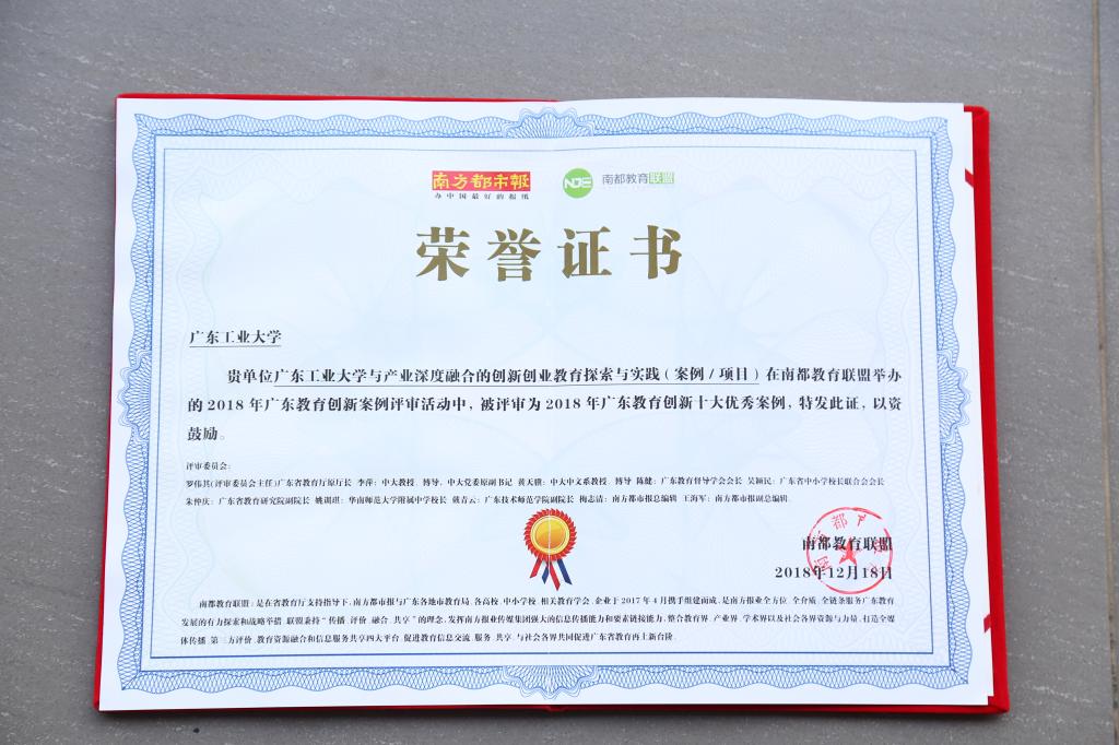 2018年12月18日出版的《南方都市报》整版报道了我校的这一做法。报道以粤港机器人学院、IC班的学生成长故事为实例,生动讲述了我校与政府、产业以及港澳方面多方协同,启动多专业融合、跨专业互动、创业引导、全程项目驱动的创新创业人才培养模式,尤其肯定了我校“以校企合作深入产教融合、以跨专业重构人才培养、以创新反哺日常化教学”的做法。颁奖典礼上,颁奖词这样写道:“粤港机器人学院,引中外瞩目;科技金融创新班,与产业共进。立足广东的转型发展,培育个性化复合型双创人才,特色鲜明,硕果累累。”