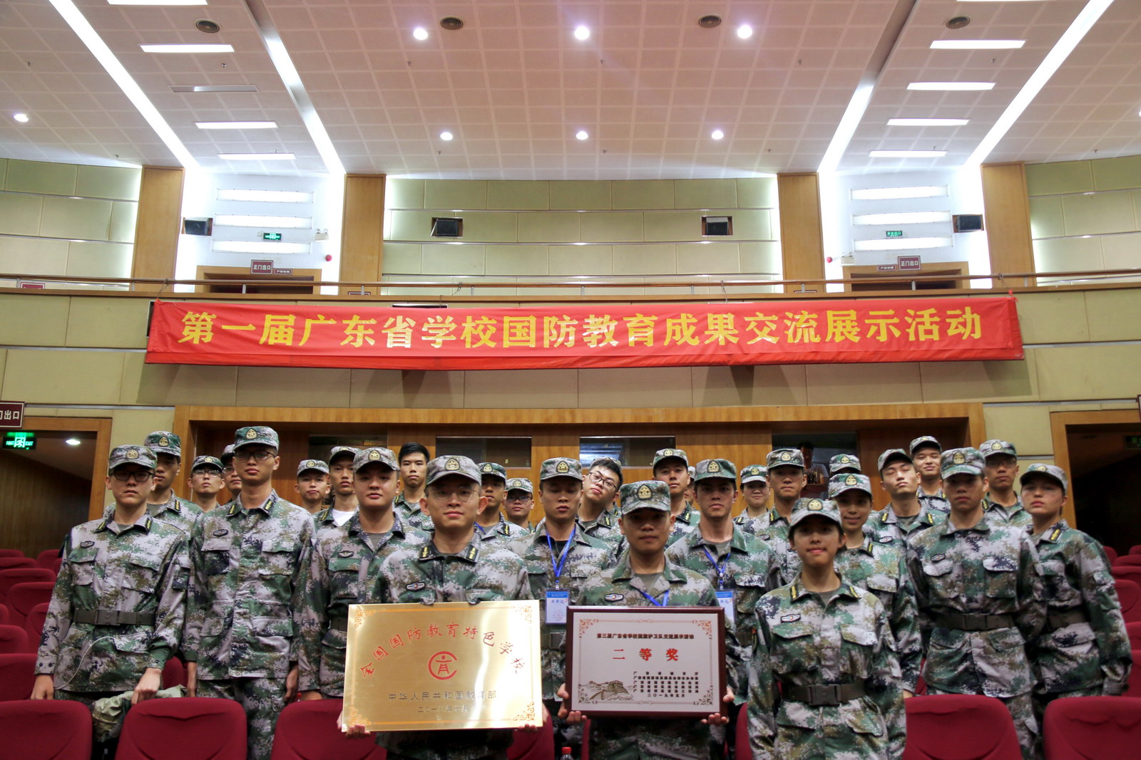 本网讯 5月8日上午,由广东省教育厅、广东省国防动员委员会综合办公室、广东省国防教育办公室、广东省军区战备建设局、广东省军区政治工作局主办的第一届广东省学校国防教育成果交流展示活动在广州科技贸易职业学院举行。经过激烈的角逐,我校国旗护卫队以标准规范的动作、昂扬的精神风貌,荣获交流展示活动二等奖,学校获授“全国国防教育特色学校”。