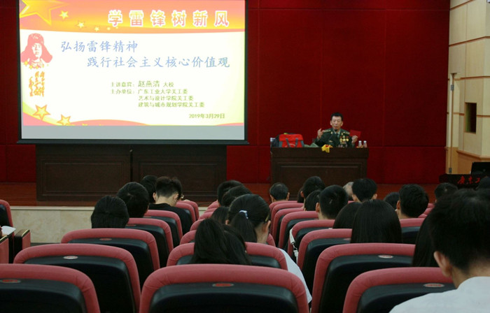 本网讯 3月29日下午,东风路校区图书馆报八楼告厅内,校关工委、艺术与设计学院关工委、建筑与城市规划学院关工委联合举办学雷锋报告会,邀请对越自卫反击战亲历者、全军学雷锋模范、一级英模、武警126师原副政委、校关工委•老教授报告团特邀赵燕清大校,到校为学生作报告。赵燕清在战争中曾两次负伤,多次立功,是党的十四大代表;其家庭曾被部队、广州市及全国妇联授予“五好家庭”、“文明家庭”等称号,2014年被评为“广州市十大最美家庭”。赵燕清以《弘扬雷锋精神 践行社会主义核心价值观》为题,紧扣社会主义核心价值观的内容,结合自己的学习经历、成长经历、参战经历和弘扬雷锋精神的亲身经历,深刻阐述了雷锋刻苦学习的“钉子”精神、爱岗敬业的“螺丝钉”精神、诚信友善的“傻子”精神和艰苦奋斗的“节约箱”精神,勉励青年大学生好好珍惜现在的大好时光,努力学习科学文化知识,发扬艰苦奋斗的优良作风,做社会主义核心价值观的践行者和传承者。最后,赵燕清以小提琴现场演奏《学习雷锋好榜样》和《唱支山歌给党听》的方式,结束这场生动而令人回味的报告。