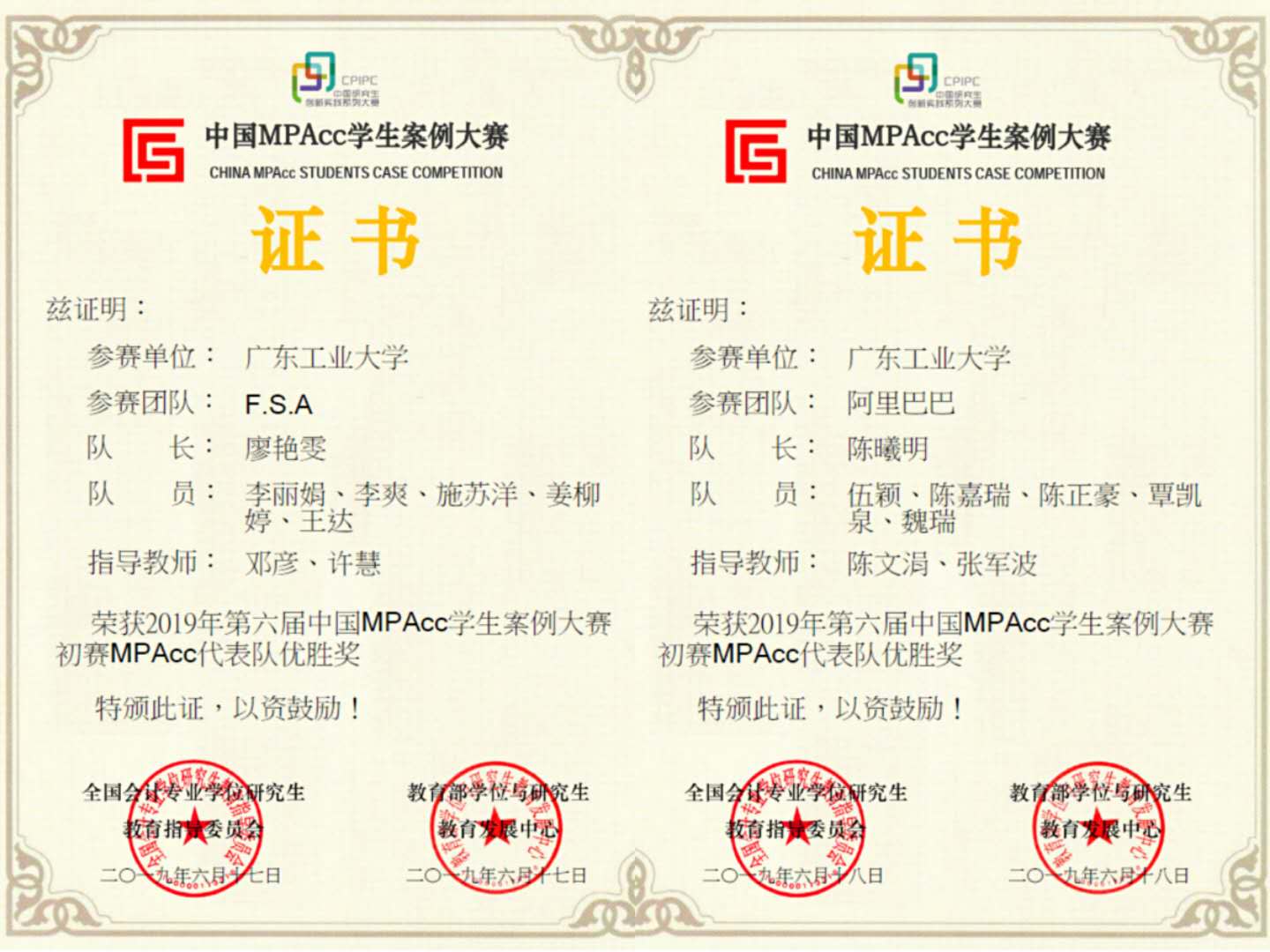 本网讯 2019年(第六届)中国MPAcc学生案例大赛于2019年6月16日在中南财经政法大学落下帷幕,我校管理学院MPAcc代表队在此届大赛中表现优异,由邓彦教授、许慧博士指导的F.S.A.队(队长:廖艳雯,队员:李丽娟、李爽、施苏洋、姜柳婷、王达),陈文涓副教授、张军波副教授指导的阿里巴巴队(队长:陈曦明,队员:伍颖、陈嘉瑞、陈正豪、覃凯泉、魏瑞)荣获第六届中国MPAcc学生案例大赛初赛MPAcc代表队优胜奖。是广东省唯一的获奖单位。