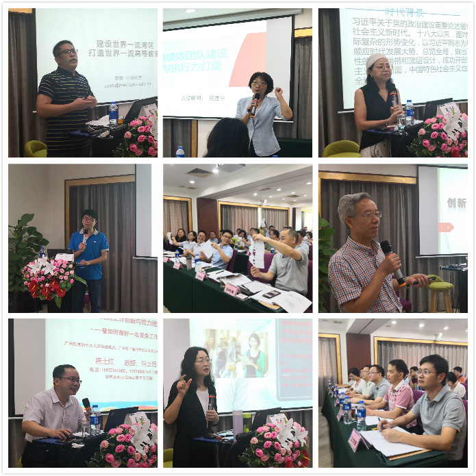 在专题教学环节,中山大学马克思主义学院夏银平教授以《新时代党的政治建设必要性》为题,从当前国际背景和党内政治生态存在的问题入手,对习近平总书记关于党的政治建设的重要论述进行了详细解读。中山大学马克思主义学院刘铁副教授以《粤港澳大湾区背景下高等教育面临的机会和挑战》为题,对如何建设一流湾区、打造一流高等教育进行了重点讲解。美国培训管理协会培训师、华为培训讲师倪建华老师,中山大学传播与设计学院吴柏林副教授分别以《高效团队建设与执行力打造》《创新思维与决策艺术》为题,围绕团队建设、领导力提升、创新管理思维等方面进行了专题辅导。华南农业大学马克思主义学院唐土红教授以《新时代党务工作创新与效力提升》为题,与学员们分享了对新时代党务工作的特点、内容及工作方法的思考。中山大学法学院庄劲教授以《领导干部法律风险防范》为题,用幽默风趣的语言,对贪污贿赂犯罪的刑法风险、规避刑法风险的常见误区等方面进行了生动讲授。中山大学传播与设计学院副院长张宁教授以《全媒体时代舆情管控与危机应对》为题,结合高校实际和全媒体的时代背景,对危机的诱因、形成、发展以及处理原则等进行了系统阐述。