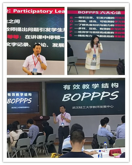 BOPPPS模型的核心有两点:一是强调学生全方位参与式学习而不只是听讲;二是要及时获得学生的反馈信息,以调整后续教学活动以期顺利达到教学目标。张胜全教授团队全体成员以小剧场的形式演练了BOPPPS教学模式,向参训老师展示在课堂教学过程中如何借鉴BOPPPS模型,充分应用灵活多样、直观形象的教学手段,鼓励学生积极参与教学过程,使学生能深刻地领会和掌握所学知识。