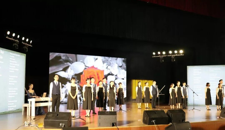 依托王尔德的诗歌《玫瑰与悲伤》(Rose and Rue),18级翻译研究生采用中、英、日、韩、法、俄版本的多语种朗诵,把观众带入夜莺与玫瑰的对话之中。王尔德讥笑,理想主义与浪漫主义是书生们的鸦片。书呆子们确实不太懂情趣,也不务实。他们以为真心一定会换真情,付出一分,一定会收获一分,不然,就埋怨这世道不公平,道义沦丧、真情迷失。阵阵雷动的掌声表达了对同学们表演的认可。