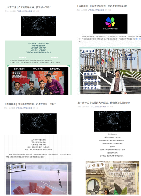 优秀青年采访推文。3月30日至4月18日期间,土木与交通工程学院团委推出4篇“土木·青年说——五四精神,传承有我”人物采访推文,阅读量近2000人次。通过视频加推文的传播形式分享优秀同伴如何学习、如何平衡各方面、如何理解与传承五四精神等问题的经验看法,营造向上氛围,推动共同进步。